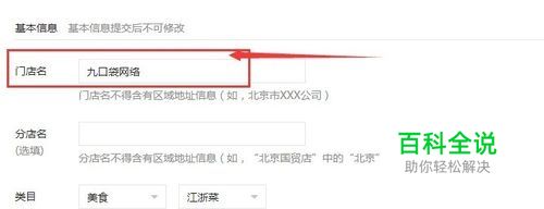 按照你自己的需求,吧您的门店的基本信息填写好,填写门店名称的时候需要注意,门店名不得含有区域地址信息(如,北京市XXX公司),分店名不得含有区域地址信息(如,“北京国贸店”中的“北京”)