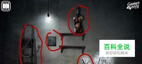 选择进入地下暗门,在地上捡起“钳子”,再点右边上面那个“↓”,进入一个有坐着的骷髅房间。点“22冷气罐”,收入物品包。打开物品包,选择“钳子”,再选右下角“黄色手掌”符号,点小红叉,回到骷髅房间,点铁链,选择“金属梯”。点墙上的密码锁,用之前看到的密码输入“247”选绿色回车,打开。密码锁后获得“胶带”。然后选择“右下角”退回到地下暗门下来的房间,再选右下角的“↓”,来到侧门通道,捡起屏幕左下方的“刀片”,回到有坐着的骷髅房间,在物品包里选择“刀片”再点“小黄手”,然后点击架子上的人体上半身解剖模型,获得“钥匙”。