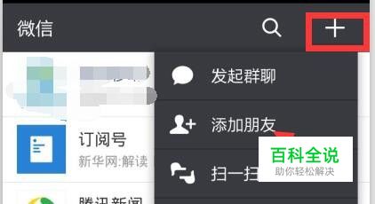 打开微信,点击右上角“+”菜单,下拉选项中选择“添加朋友”。