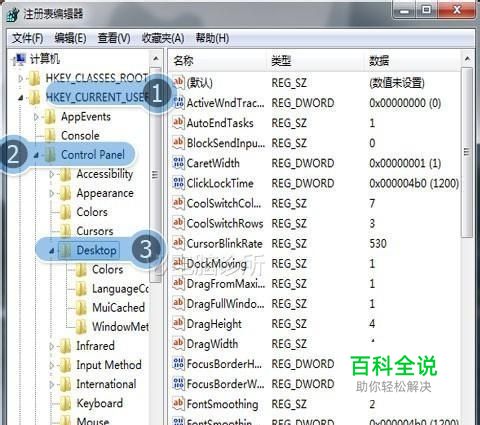 展开到"HKEY_CURRENT_USER\ControlPanel\Desktop"下,如图所示: