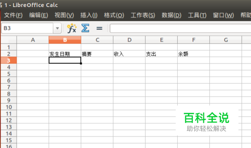 输入表头文字。 打开电子表格软件,输入表头文字,这里的表头包括:发生日期、摘要、收入、支出、余额五列。 输入表头文字时,输入完一个单元格中的文字,按 Tab 键转到下一个单元格;最后一个单元格输入完成后,按下回车键,活动单元格自动变成当前数据区域下一行的第一个单元格。