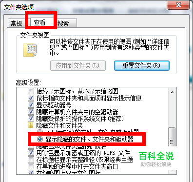在文件夹选项的页面中,切换到 查看栏目,选择 显示 隐藏的文件、文件夹,点击 确定,退出即可