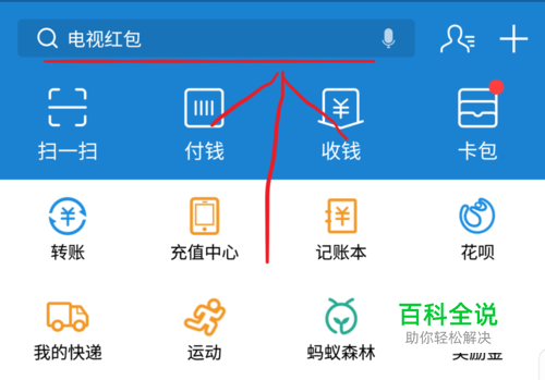 最近支付宝有个每天都能领一个红包的活动; 我们打开支付宝,点击搜索框;