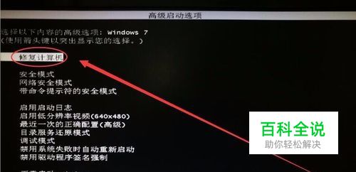 在提示进入“安全模式”界面时,用键盘上的上下箭头键,选择“修复计算机”,使系统还原到最近的一个正常状态。