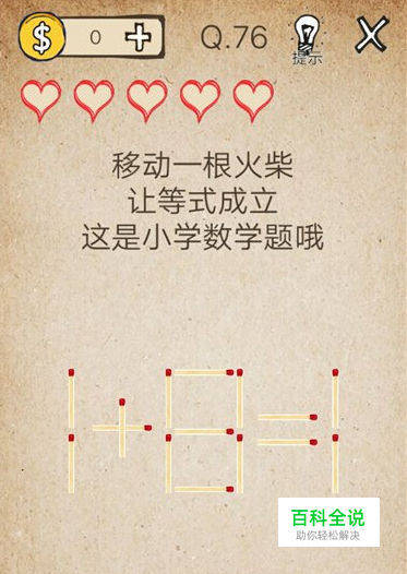 我去还有这种操作第76关答案:这关说是小学题目,其实我们可以将加号中的竖着的火柴移动到等号上,构成不等式即可过关。
