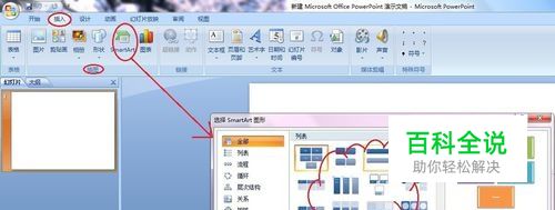 插入SmartArt图形需要通过【插入】选项卡来实现,打开【插入】选项卡,找到【插图】组,单击【SmartArt】按钮,在弹出的SmartArt图形对话框中选择需要的SmartArt图形。如图: