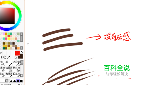 本人使用的是wacom 影拓牌子,但这些方法都是通用的,先打开sai,用压感笔画几条直线,发现直线粗细一样,就是没有压感了,这样会出来的线条也不好看。