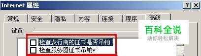去掉“检查发行商的证书是否吊销”、“检查服务器证吊销”这两个前面的勾,如下图所示: