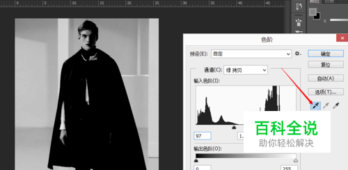 Ctrl+L打开色阶,把对比度拉大,可以点击吸管图标,给人物自定一个黑场。然后把人物白色的地方用黑色画笔涂黑。