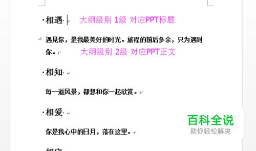 先把使用样式把文字处理一下,标题设置大纲级别为1级,内容设置大纲级别为2级。如何设置大纲级别,请参考下面的经验。