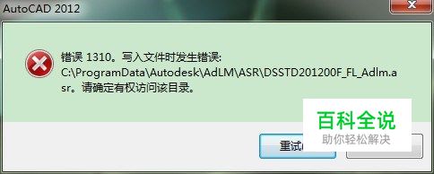 window7 X64位系统,在安装Auto CAD2012时出现错误1310时,如图所示,不要惊慌,这个不是软件的问题,下面就是我亲测有效的办法,希望能帮助到和我一样遇到这种问题的人。
