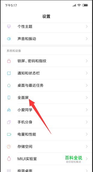 然后在设置中,我们找到系统和设备选项,然后在系统和设备选项中我们找到全面屏设置,点击进入。