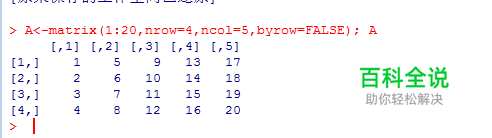 2.现在我们依葫芦画瓢。代码编写如下。 matrix(1:20,nrow=4,ncol=5,byrow=FALSE) 分析: 矩阵A的数据是1-20,在R语言中1-20就是1:20,4*5的意思就是4行5列。 byrow=FALSE是按列来输入。
