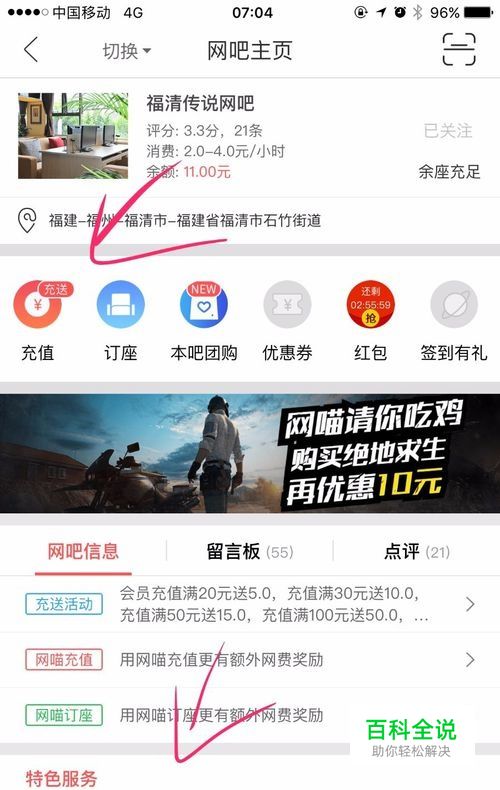 我们点击一个网吧进来,在里面有充值和订座服务,可以看一下网吧的特色,看上一个小时多少钱,点击充值按钮进行网费充值。
