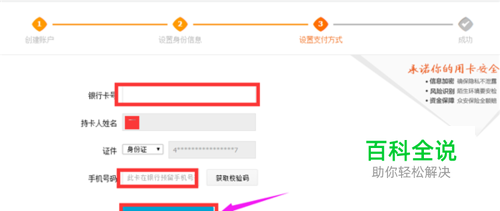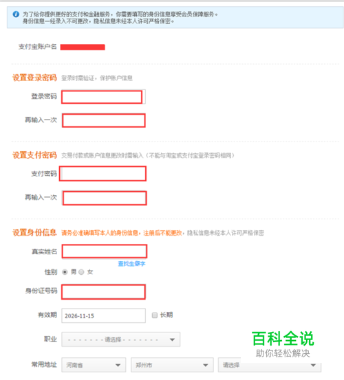 在进入的页面中输入个人的相关的信息,登录密码,支付密码,真实姓名,身份证号码,有效期,常用地址,完成后点击“确定。”