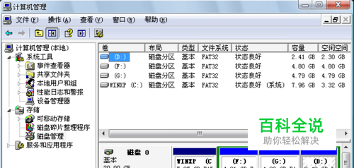 打开“控制面板”-“管理工具”-“计算机管理”,如图。点击左侧的“磁盘管理”,右边窗口会显示出当前系统下的分区情况。