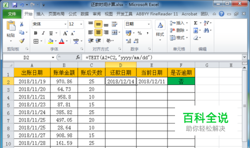 F2单元格里面输入公式=IF(D2>=E2,"否","是"),即:如果还款日期大于或等于当前日期,则说明没有预期,否则将会是逾期。