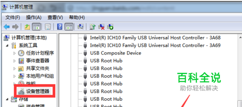在打开的“计算机管理”界面中,切换到“设置管理器”选项卡,展开“通用串行总线控制器”列表,从中查看“USB大容量存储设备”的状态,如果处于禁用状态,则右击选择“启用”项。
