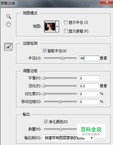在工具栏右侧单击“调整边缘”选择 黑底模式,勾选智能半径和净化颜色选项,将半径设置为40像素。