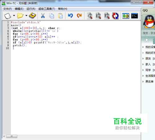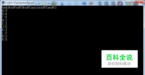 把下列代码复制到编辑区,如下图所示 #include"stdio.h" main() { int a[100]={0},i,j; char c; while((c=getchar())!='\n') /*获取字符并统计每个字母出现次数*/ for (i=65;i<=90;i++) if(c==i||c==i+32) a[i]++ ; for (j=65;j<=90;j++) /*输出统计信息*/ if (a[j]>0) printf("%c:%-3d\n",j,a[j]); getch(); /*保持命令提示窗口不被自动关闭*/ }