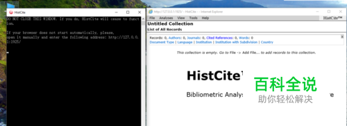 下载安装从histcite网站下载软件或,安装之后,点击histcite图标即可开启软件;软件打开后的窗口类似IE的界面,注意,左边黑色的运行窗口不用关闭,最小化即可;