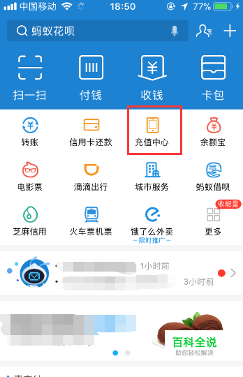 我们要想通过手机支付宝软件给家里人充值话费,首先需要点击支付宝主页的“充值中心”按键。
