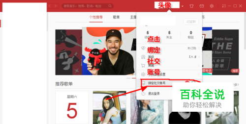 登陆后,点击右上角的头像后面的 昵称,在窗口中点击最下面的绑定社交账号。