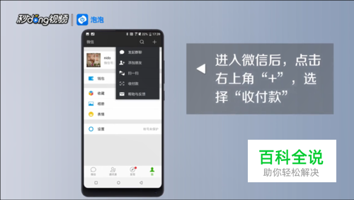 首先打开微信,点击右上角的“+”符号,选择收付款。