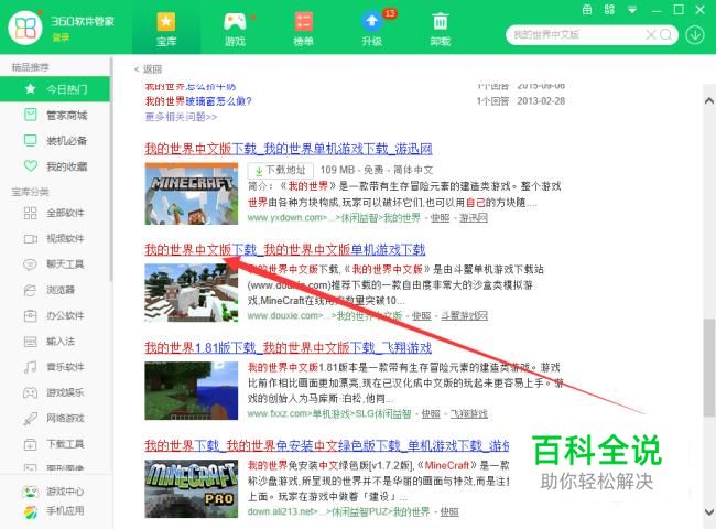 进入软件管家之后,输入我的世界中文版,之后会出来一个下拉框,在下拉框找到我的世界中文版下载,点击进入。