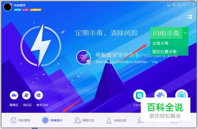 然后点击左下角的“病毒查杀”,然后点击右上方的箭头,选择全盘杀毒。