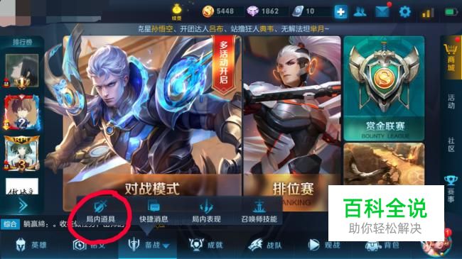 首先我们进入游戏王者荣耀,在下方点击备战,然后点击局内道具。