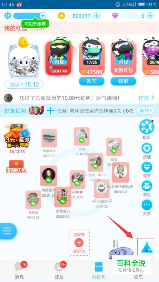 登录派派进入派派主页面之后,我们点击右下角的“家族按钮”(这里需要保证自己现在是无家族状态,而且等级要大于等于20级才可以)。