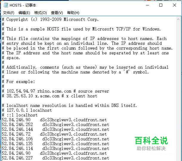 修改HOSTS文件,由于HOSTS文件具有管理员权限,先将HOSTS文件移至桌面,以记事本形式打开,并将以下内容复制至文件后面: 52.84.246.90 d3c33hcgiwev3.cloudfront.net 52.84.246.252 d3c33hcgiwev3.cloudfront.net 52.84.246.144 d3c33hcgiwev3.cloudfront.net 52.84.246.72 d3c33hcgiwev3.cloudfront.net 52.84.246.106 d3c33hcgiwev3.cloudfront.net 52.84.246.135 d3c33hcgiwev3.cloudfront.net 52.84.246.114 d3c33hcgiwev3.cloudfront.net 52.84.246.90 d3c33hcgiwev3.cloudfront.net 52.84.246.227 d3c33hcgiwev3.cloudfront.net 保存并将修改好的HOSTS文件移至原位置 C:\Windows\System32\drivers\etc下。