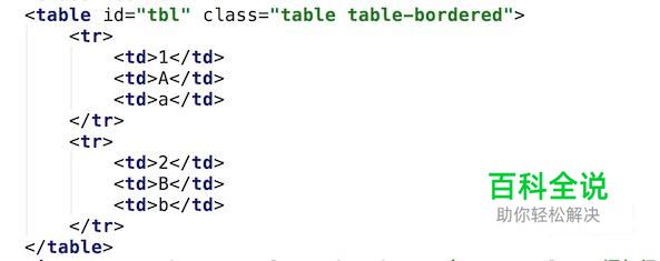 然后看下我们的html初始的 table, <table id="tbl" class="table table-bordered"> <tr> <td>1</td> <td>A</td> <td>a</td> </tr> <tr> <td>2</td> <td>B</td> <td>b</td> </tr> </table>