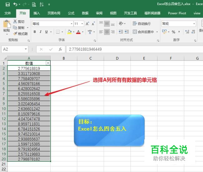 表格A列有一组小数数据,这里的数值在小数点后很多位数,现在将这组数值进行四舍五入,保留到小数点后两位