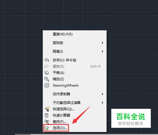 打开CAD后可以看到操作界面的背景色是黑色的,在绘图区里单击鼠标右键在弹出的右键菜单里找到选项选项,如图所示: