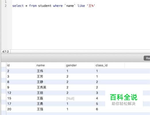 如果要查询所有姓王的学生,这个sql怎么写? 我们可以用 like关键字, select * from student where `name` like '王%' 这种匹配以‘王’字开头,后面任意字符的数据