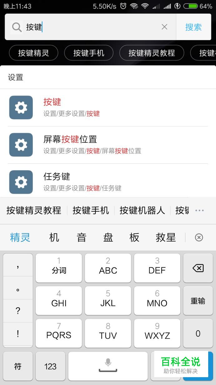 然后点收缩框,输入“按键”二字然后下面就会出现:按键,屏幕按键位置,任务键。这三个,点进去任何一个都可以