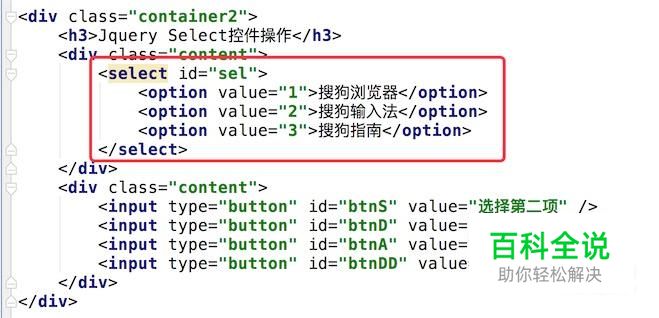我们加上代码,实现第一个按钮的逻辑。 用代码去选中下拉框的值,用Jquery的 val()方法就行, $("#sel").val('2'); // 2就是下拉框对应项的value值。