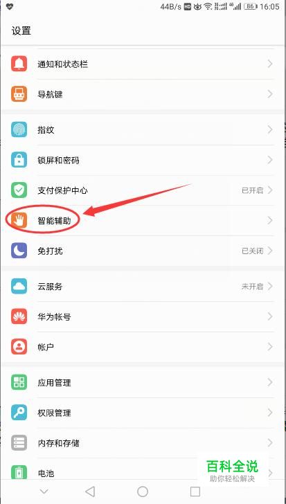 首先,我们手中这台华为p9以及更新了华为最新的EMUI5.0系统(基于安卓7.0),让我们打开手机的设置,然后用手指下滑,在菜单中找到“智能辅助”这个选项,然后点击进入。