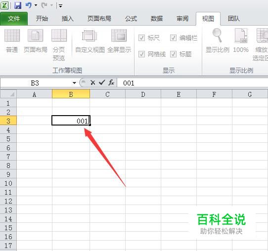 如图,比如我们在Excel表格中输入001,。