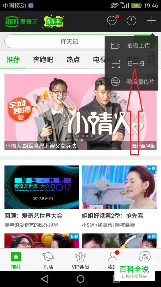 快速打开爱奇艺APP,点击右上角的“+”图标,再点击扫一扫。
