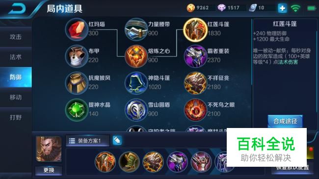 第一件:红莲斗篷。装备属性:+240物理防御、+1200最大生命值、唯一被动每秒对身边敌军造成100-240点法术伤害。由此可以看出,这件装备非常全面地提供了攻击、防御属性,是一件非常均衡的装备,也是程咬金前期必备的装备。
