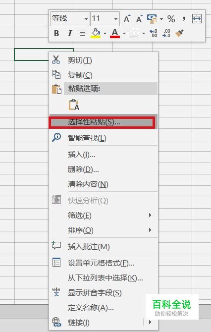 方法二:当我们有时需要从别的地方复制身份证号来粘贴到单元格内,就可以使用这种方法。首先复制身份证号,然后鼠标右键点击单元格,选择“选择性粘贴”选项。