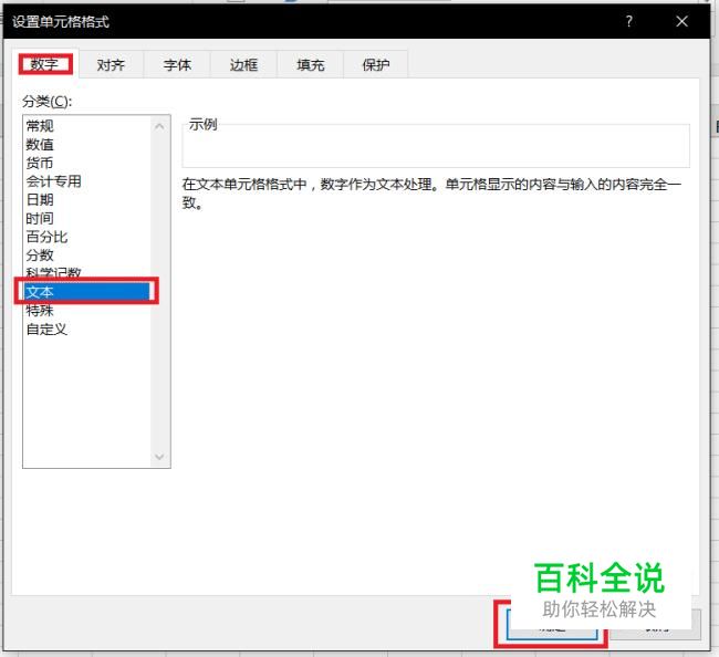 在选择“设置单元格格式”选项后的弹窗中的“数字”选项卡中,选择“文本”选项,点击确定。就可以任意的输入数字了