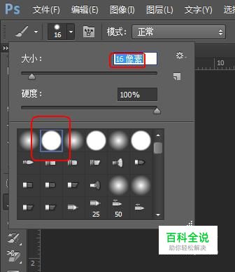 在工具面板上点选“画笔工具”,在其工具栏上选择“硬边圆”并设置合适的画笔大小。