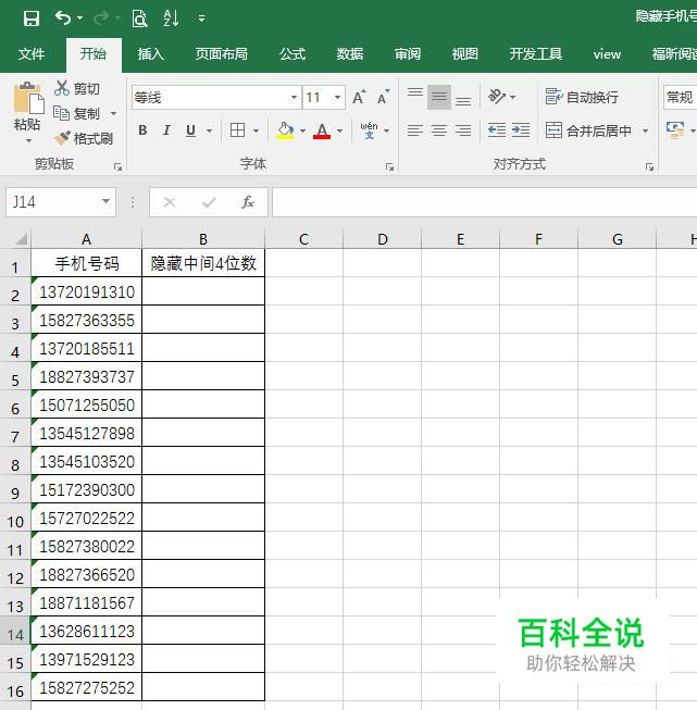 在B2单元格中输入公式 =LEFT(A2,3)&"****"&RIGHT(A2,4) ,手机号有11位数,隐藏中间4位数则是将手机号码分为三部分,左边的3给数字加上中间的4位星号和右边的4位数字,输入公式后将公式向下填充