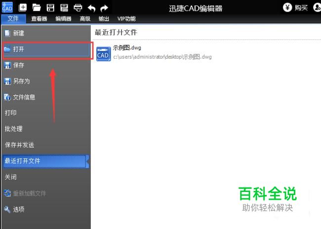 运行CAD编辑器,软件打开之后,点击“文件”选项,然后再点击“打开”选项将需要进行编辑的CAD文件打开。
