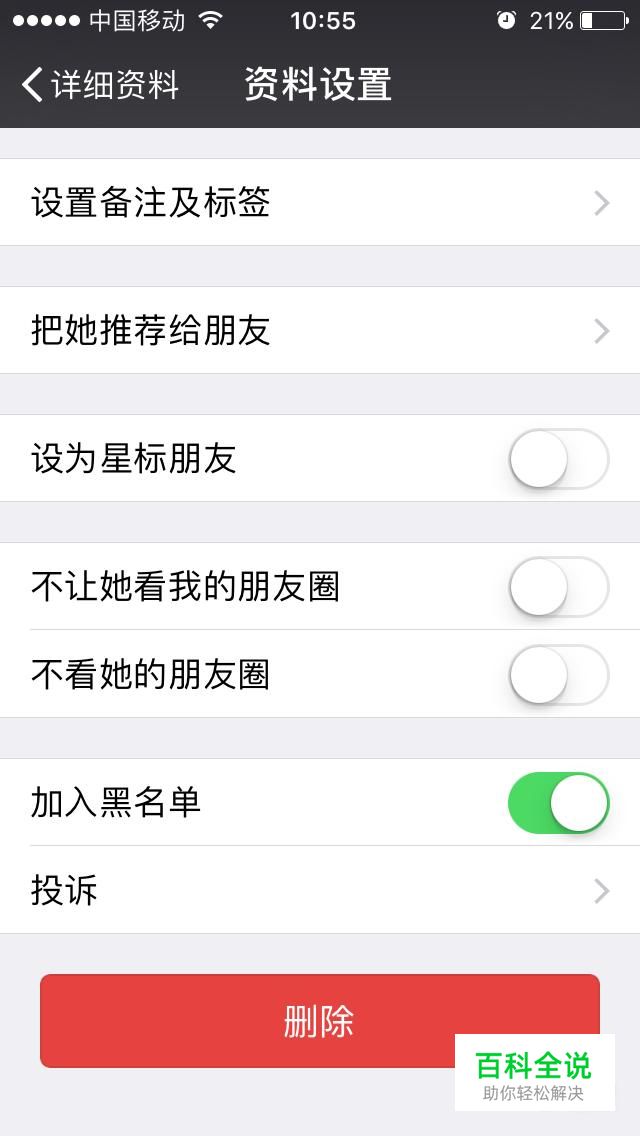 然后在资料设置里面选择加入黑名单,点击右侧的白色按钮,使之变成绿色;