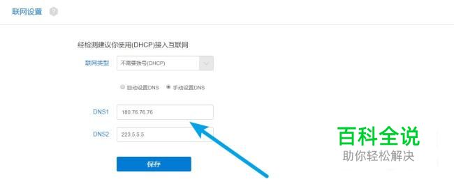 在dns编辑栏中输入dns服务器地址,小编这里建议使用180.76.76.76。即可正常打开网页。